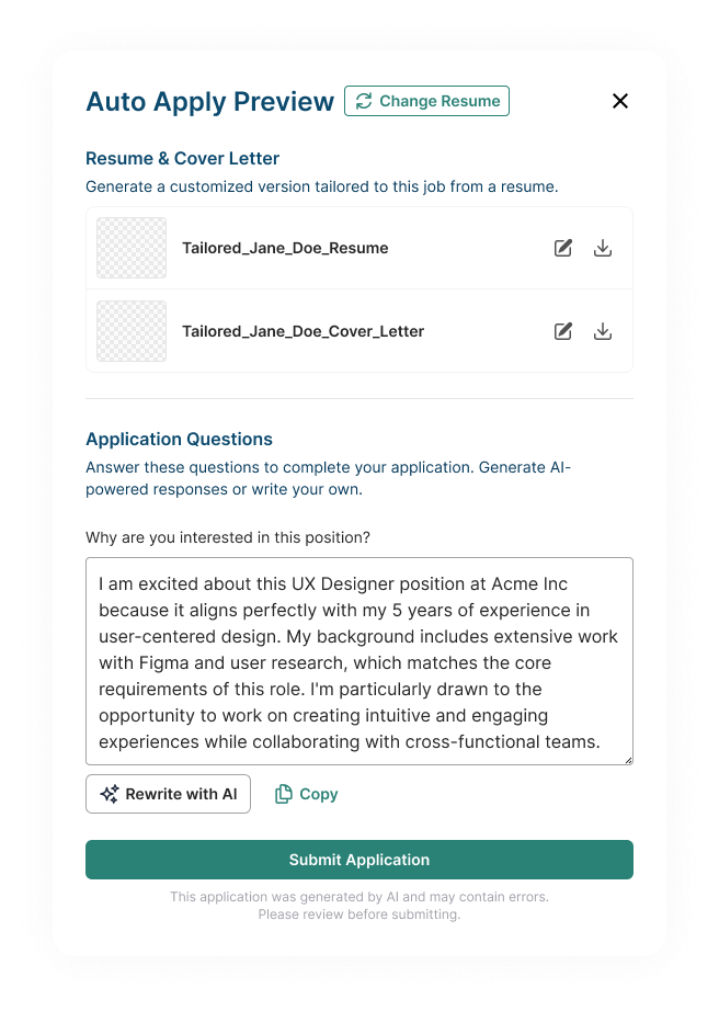 Stay in control of quality. Before any application goes out, you review and edit your tailored resume, cover letter, and regenerate pre-filled answers. AutoApply automates the busywork, but you approve the final product.